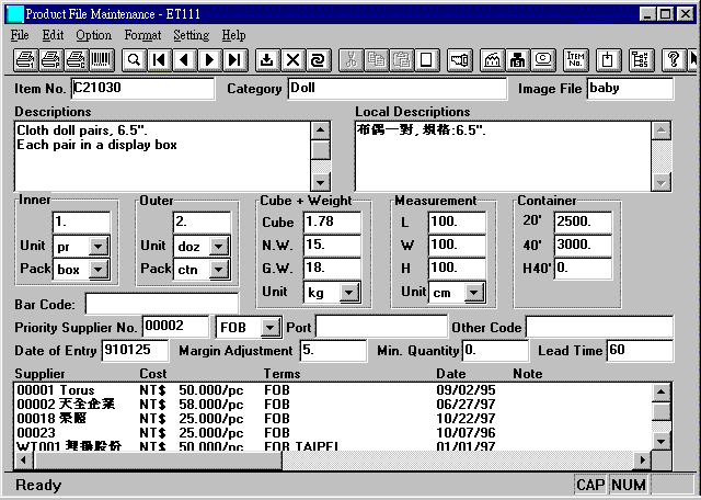 要刪除資料, 按 Delete. 輸入時如需 Supplier No. 資料,